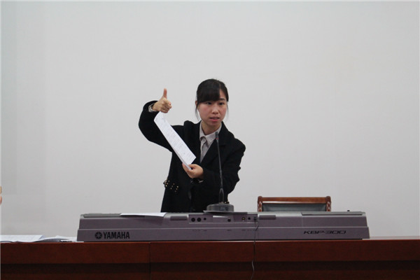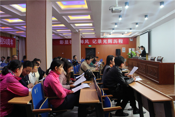 同时,为了迎接下个月将要进行的合唱比赛,教师合唱团的众位老师们也在积极地备战中。合唱团的全体教师每周都要固定时间,集中练习。这不,走近办公楼三楼的大会议室,激情昂扬、嘹亮动人的歌声传如耳中,像一泓潺潺清流,滋润着我们的心田。音乐教师韩莎莎正一边为大家弹琴伴奏,一边向老师们讲授演唱技巧、和声的演绎方式以及如何熟练控制好节奏。老师们跟着节奏认真的反复练习着。