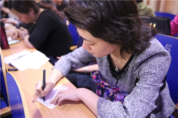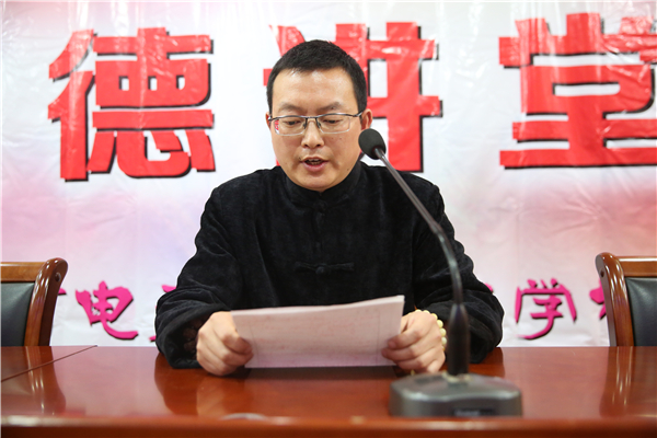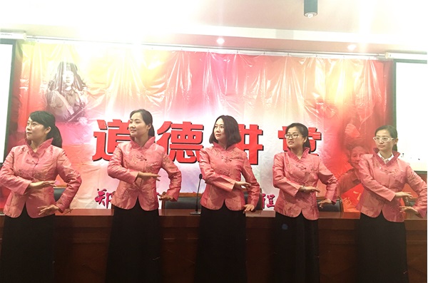 本次“道德讲堂”活动的开展,起到了让大家品悟道德力量,升华自身境界,净化大家心灵,弘扬正气的作用。值得一提的是在唱歌曲环节,我校5位女教工自发精心为学习活动排练的手语舞蹈《礼》使课堂充满了活力,丰富了课堂形式,大大提高了课堂效果;在学模范环节,郑州市五星级社团-国学社创办人、国学文化进校园的发起人,我校年轻教师孙海潮老师从说文解字的角度阐释了“礼”的内涵,分享他在黄帝故里拜祖大典上的心得体会来,并带领大家一起诵读了国学经典《大同文》。整堂课在温馨、和谐的氛围中进行。一张张吉祥的卡片传递的是彼此对道德的感悟与传承,深深地面对“德”字虔诚鞠躬,也表达了人们心中那份对道德无比的敬慕。
