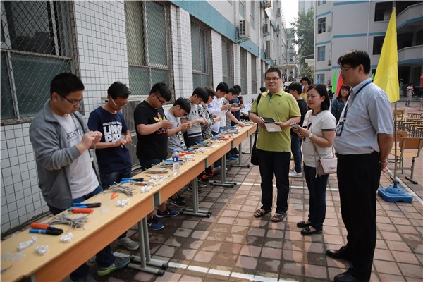 为突显校园科技文化艺术节“弘扬工匠精神、打造出彩人生”的主题,学校各系部共设置了26个技能竞赛项目,创造了学校科技文化艺术节之最。 在这些竞技项目里,信息技术系的《跳线制作》、现代制造系的《电工接线技术》、艺术工程系的《美甲四项》、基础部的《制作模型》等项目,都是要求较高的“技术活”,非常能够体现职业教育的技能教学特色,当然也受到了学生们的欢迎。经过层层选拔,参加30日总决赛的选手们都是技术高超的“小工匠”,卯足了劲要在全校师生的面前展示自己的身手。一段电线精确到毫米不差、一个焊接微细到针眼大小、一块指甲精美到靓丽如画、一个模型体现出科学原理等等,都是按照工匠的标准要求来竞技的,充分体现了该校重视技能教学、培养工匠人才的教学理想。