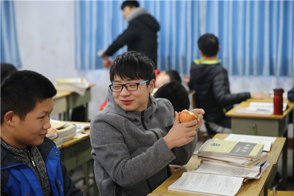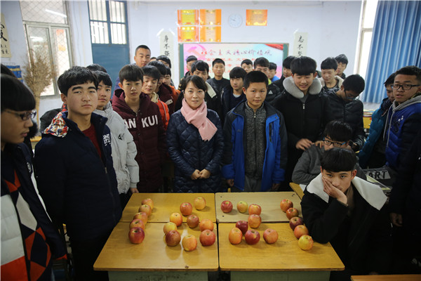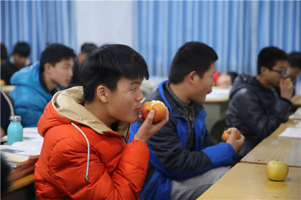 1621班的班主任张丽君老师早就开始盘算着为学生组织一个有意义的平安夜活动,悄悄的为学生准备了一箱苹果。在接到学校的停课通知后,她把苹果搬进了教室,给每一个孩子都发了一个苹果。学生们惊讶之际,张老师为学生上了临时的科普班会——《苹果对肺部的保护作用》。张老师从苹果的养生功能和营养价值谈起,说到了雾霾的起源和危害,告诉了同学们防范雾霾的基本要领。最后,她说:“同学们,苹果能润肺,希望大家在停课的时间里每天都吃一个苹果,保护好自己的身体,不要到处乱跑,教室里有空调、有网络,我们按照老师的要求自习,也可以多了解一些雾霾的知识,让我们的每一天都像平安夜一样快快乐乐!”