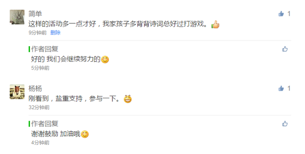 从官微留言和后台数据来看,这项活动受到该校学生、家长和老师的广泛关注。有参与该校“首次网络诗词大会”的学生家长留言说,希望学校能多推出这样的线上活动,不仅将课堂内容以趣味活动的形式延伸到课外,也促进孩子养成好的学习习惯。