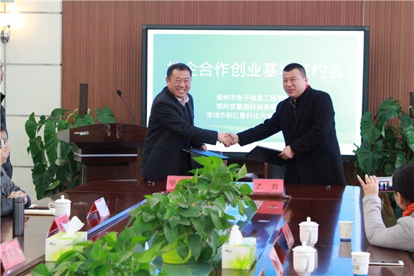 签约会由信息技术系主任闫战伟主持,深圳市新红景科技开发有限公司冯川总经理和郑州京慧越科技有限公司郑凯彬总经理作为企业方到会。校长李京辉、副校长李滢、纪委书记史秀丽、招办主任李向伟、教务处主任席明闰、实训处主任刘奇超、信息中心主任周斌和创业基地负责人赵建伟老师、徐红宇老师代表校方参加了会议。