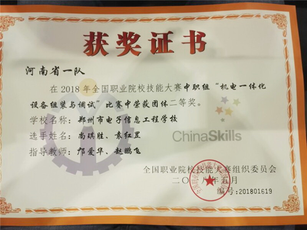 5月7日,在天津机电职业技术学院举办的全国职业院校技能大赛中职组机电一体化设备组装与调试赛项闭幕式传来消息,郑州市电子信息工程学校参赛选手尚琪胜、袁红罡在指导教师邝爱华、赵鹏飞的带领下,与全国的高手对决,最终获得二等奖的好成绩。