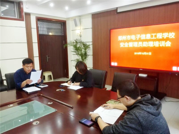 为深化平安校园建设,确保学校安全稳定,切实落实“一岗双责,齐抓共管”责任制,提升全体教职工安全管理水平,更好地担负起安全工作重任,2018年10月30日下午,郑州市电子信息工程学校举行了新一期安全管理员队伍培训会,这也预示着我校安全管理员队伍的又一次发展壮大,安全管理工作登上了一个新的台阶。