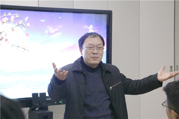 接下来,陈雨老师为大家展示了《春江花月夜》的朗诵。他先为大家解释了本诗的思想内容和情感。然后随着音乐的起伏,开始了这首经典诗歌的演绎。本诗每句都是七个字,朗诵难度较大,而且情感也不好把握,但是这些问题对于陈老师而言都不是问题。大家都被陈老师的朗诵深深地吸引了,静静地感受着古代诗歌的魅力。
