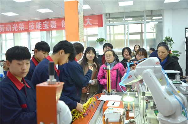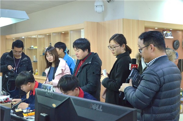 汇报结束后,在领导班子的带领下,媒体团对学校的专业文化建设、实训室、创客基地等进行了实地参观采访。在参观的过程中,媒体团队看到了智能化的技能手段“机器人”,看到了前沿型的电子产品“3D打印”,也看到了“建设供热通风与空调系统展示中心”,“计算机与数码产品维修创客基地” 、“平面设计创客基地和就业创业服务中心”,不同专业的现场维修与服务。期间,各家媒体还对专业老师、学生进行了采访,通过交流采访,媒体人深深感受到职业教育的变化与创新,老师们得到了专业知识的完善和升华,学生得到了理论和实践的双向培养和发展,使学生在校园中就接受到企业的实用技能。