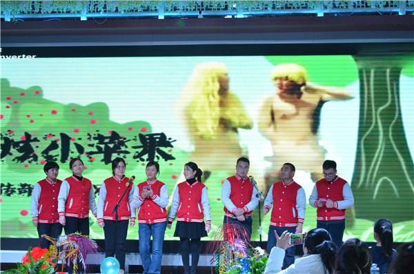 在随后的联欢中,学校不同系部、处室的老师们载歌载舞,喜气洋洋,共演出了19个节目——既有热爱乡土、赞美校园的诗朗诵《老家河南》、《校园颂歌》,也有展现活力、团队协作的舞蹈《爱在人间天堂》、《舞蹈串烧》、《板蓝花儿开》;既有致敬传统文化的昆曲独唱《懒画眉》,也有表现日常工作的舞台短剧《丢手绢》;既有借古讽今、提倡环保的小品《敢问路在何方》,也有弘扬爱国精神、正能量满满的小品《非诚勿扰》;既有展现个人风采的独唱《追寻》、《这个年纪》、《追梦》和《绿叶对根的情谊》,也有体现集体力量的合唱《声律启蒙》、《映山红》、《最炫小苹果》、《我们正青春》和《朋友》。而校级领导班子则在一个小舞台剧《神秘节目》里,从分管不同工作副校长的视角,展现了全校的工作,诙谐幽默和表现形式把联欢会推向了高潮。