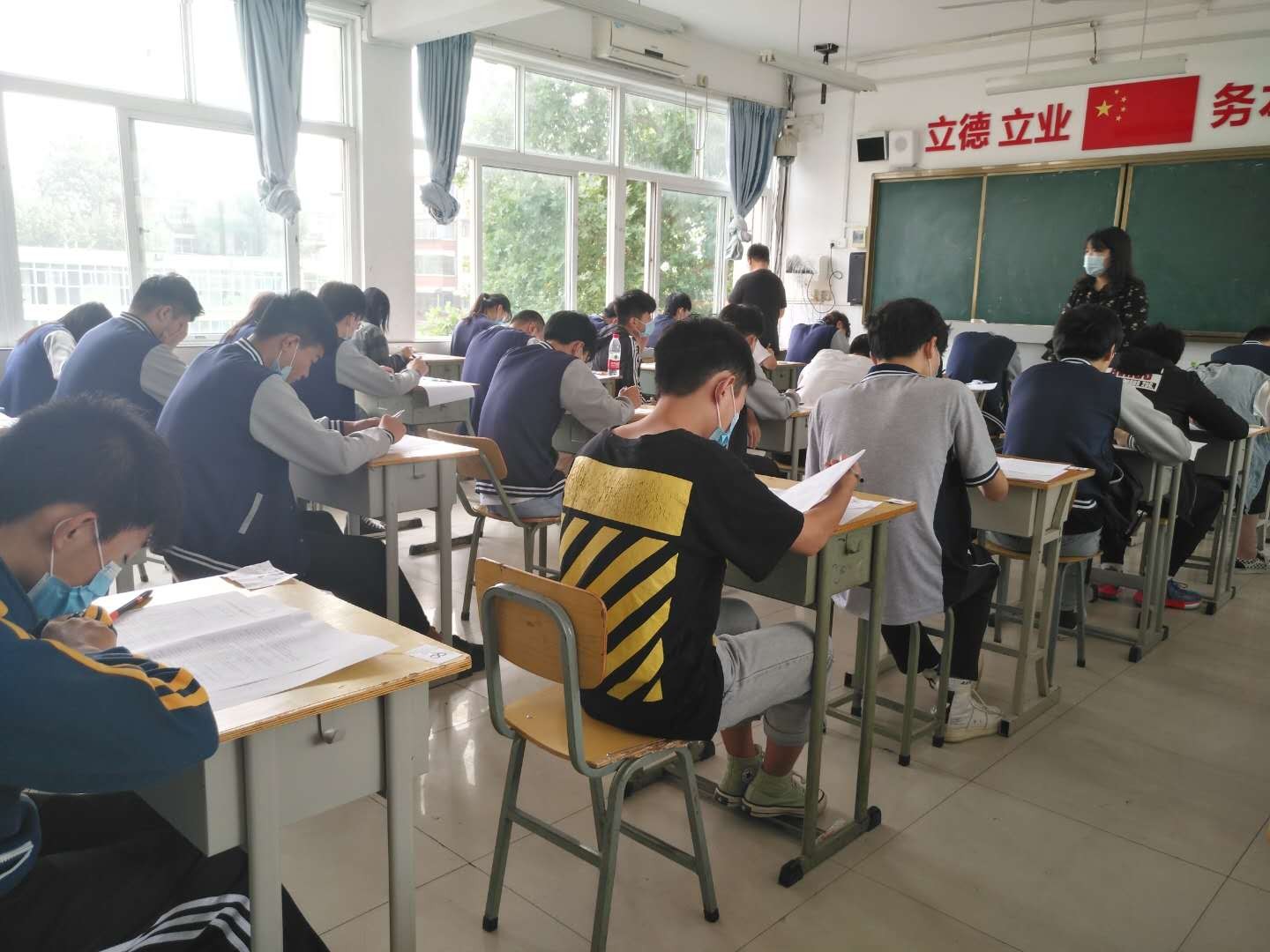 教务处席明闰主任对本次监考的所有教师进行了培训。席主任明确提出本次考试因为处于疫情的特殊时期,所以从筹备到进行都与往年不同。每个考场安排了35个座位,要求每位考生从教室的后门进前门出,沿闭环路线进出考场,学生必须保持一米左右的间隔。每个考场对桌面、地面和墙面等设施进行全面消杀。考试的纪律比以往更加严格,要求每位考生和监考老师必须佩戴口罩入场,入场前需进行手部的酒精消毒,不戴口罩和不进行消毒者禁止入场。