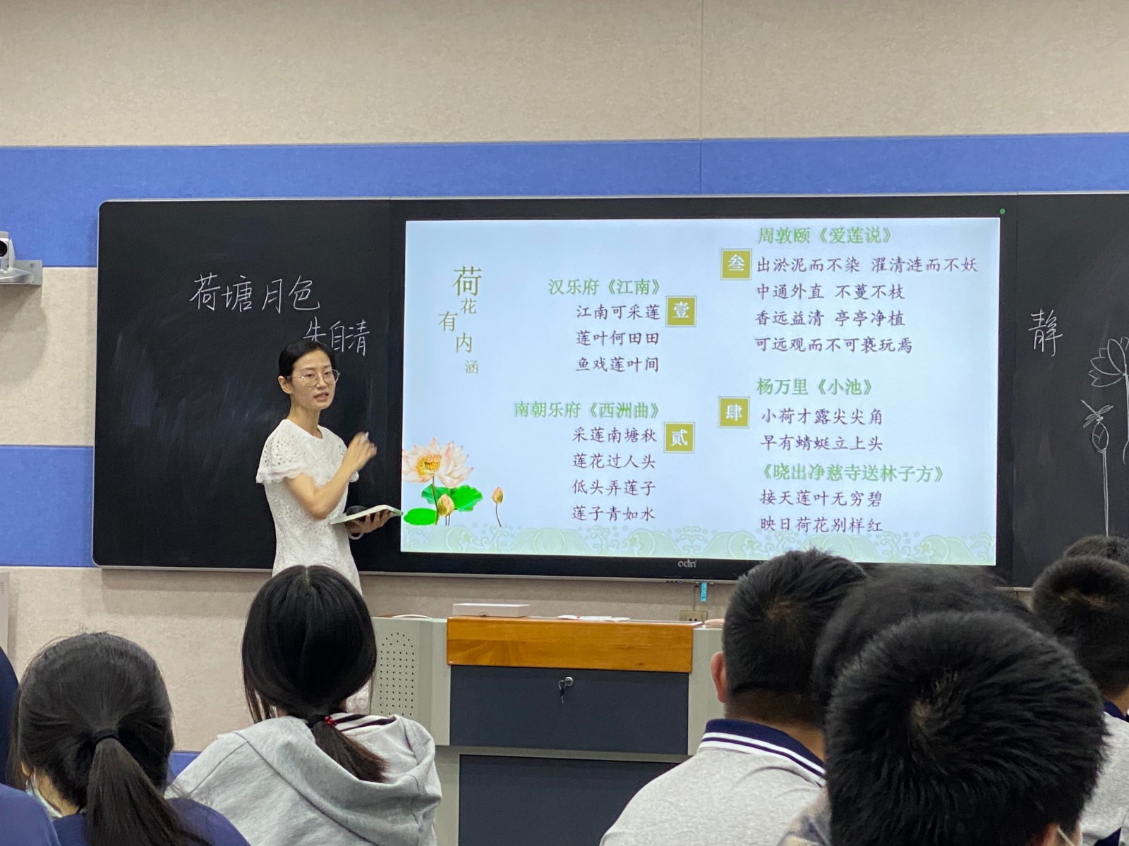 赵醒老师的《荷塘月色》,把同学们带入了唯美的景色之中。通过对古诗词典型意象的鉴赏来学习情景相融的写作手法。