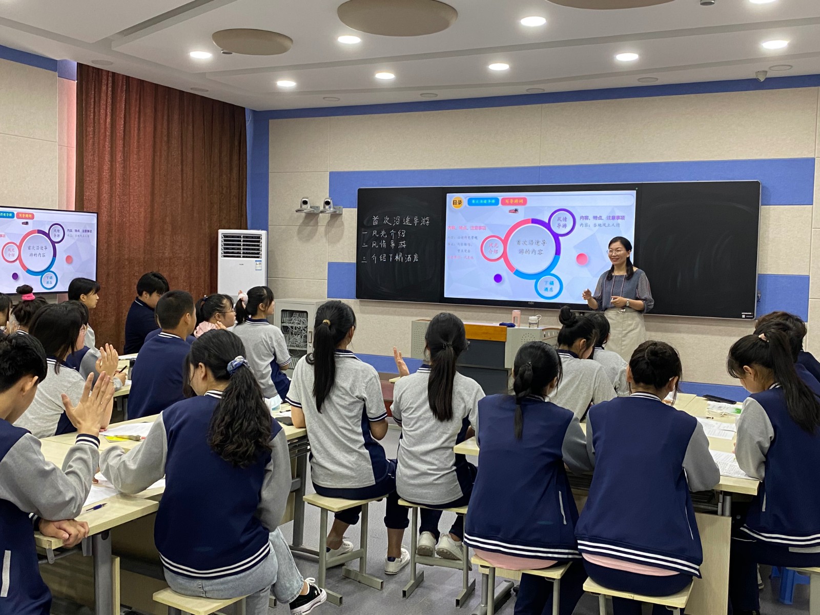 史文静老师教的是旅游专业的学生,她的示范课标题为《首次沿途导游》。她的课结合了学校大型活动的举办,既有微课的展示,又有信息技术的运用,既有自己的示范讲解,又有学生的模拟讲解。形式多样,内容丰富,主次分明。