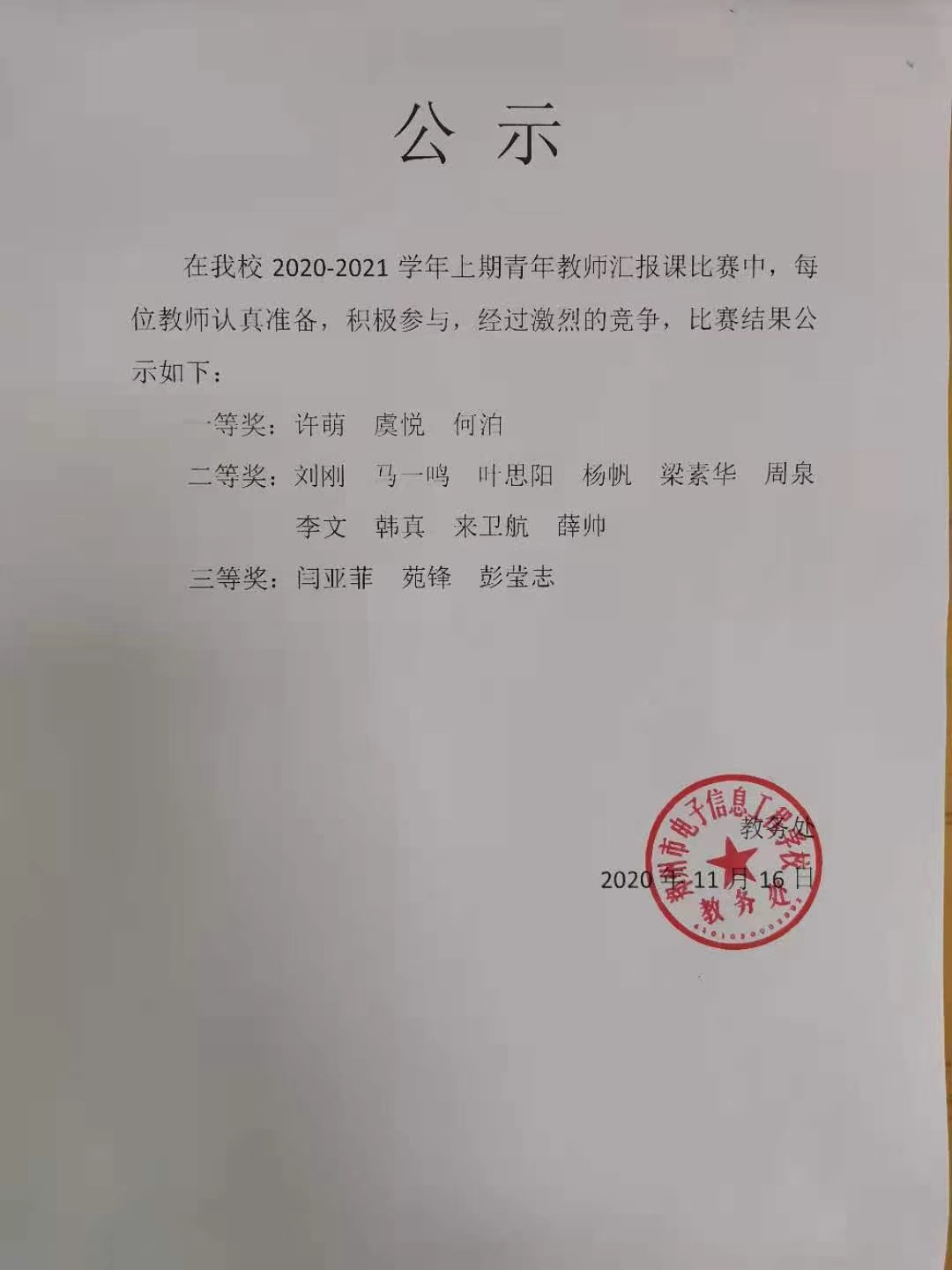 11月13日上午,由学校组织的评审委员会老师及本次青年教师汇报课评委一起进行了交流点评,在充分肯定了青年教师课堂内外所体现出的优点的同时,也全面总结了课堂内外存在的问题。经评委组集体讨论、研究,最终评出了三名青年教师获汇报课一等奖,十名青年教师获汇报课二等奖,三名青年教师获汇报课三等奖。