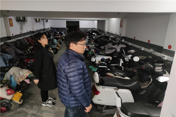 检查成员(右一)查看电动车棚是否存在安全隐患