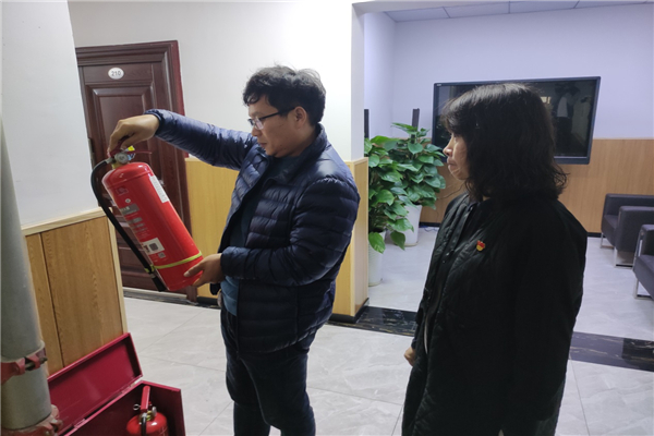检查组成员(右二)检查消防设施是否符合要求