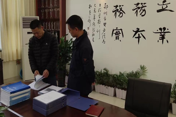检查组成员(右二)认真查阅档案资料
