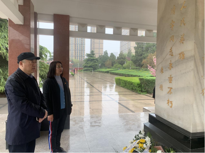校党委书记、校长李京辉、副校长于蓉参观纪念亭(郑州烈士陵园)