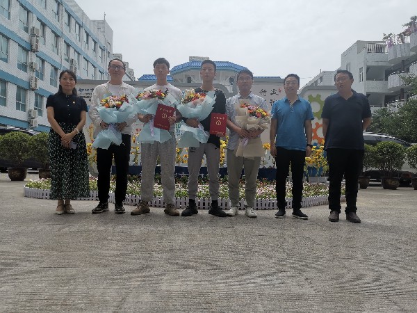 选手闫宏武、刘刚与辅导教师葛硕硕(右一)、赵鹏飞(左一)在赛场外合影