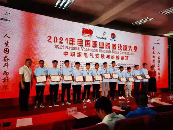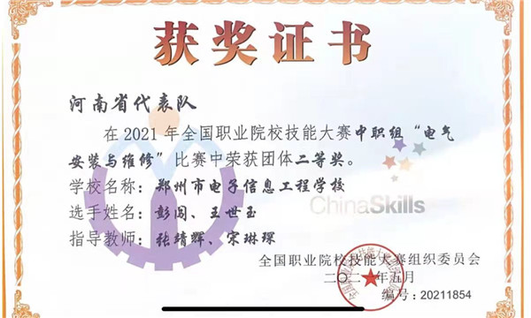 7月20日,2021年全国职业院校技能大赛中职组“电气安装与维修”赛项的在佛山闭赛,代表河南省参加该项目的比赛的郑州市电子信息工程学校的选手彭闯,王世玉,在指导教师张靖辉、宋琳琛的辅导下,规范操作、默契配合,最终在32支代表队、64名选手中斩获银牌,荣获二等奖第一名。