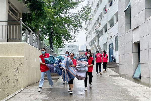 郑州市人民政府办公厅驻思源社区值班点的值班人员与志愿者一同整理被褥