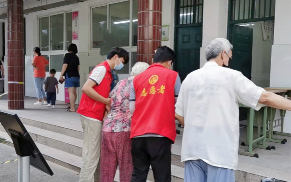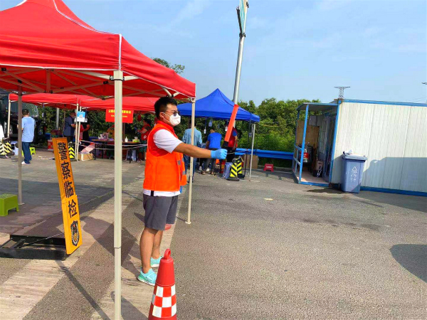 防疫工作志愿者李水冰(左一)、何泊(左二)引导检测居民