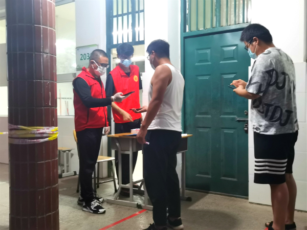 防疫工作志愿者苗畬(左一)进行扫码工作