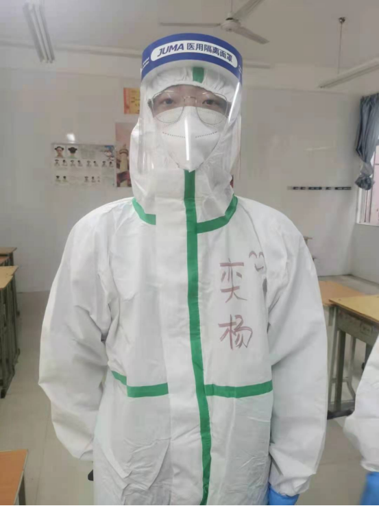看到医护工作者穿着密不透风的防护服,连续超过12小时工作强度,学校志愿者看在眼里,敬在心里。党员志愿者苗畬主动请缨穿上隔离服,站在了医疗工作队里,做记录、拿试剂、做消杀,短短几个小时,都让他感觉到汗流如注,体力不支,但他依然坚持到深夜,直至送走最后一名居民。