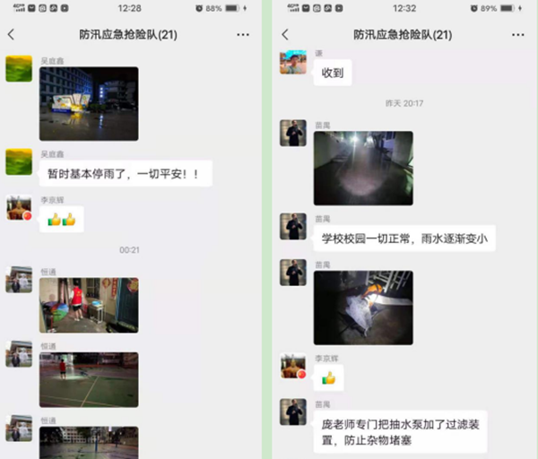 半夜凌晨,应急抢险队员冒着大雨在校园内进行巡视,微信群里不停发来他们排查时拍的照片,报告校园安全状况。