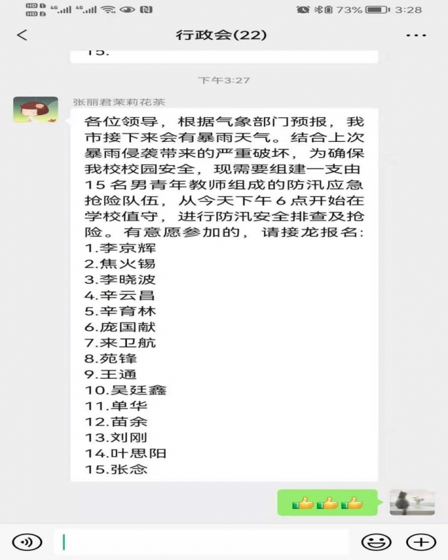 在获悉暴雨预警信息以来,郑州市电子信息工程学校认真贯彻落实上级关于防汛的工作要求,提前谋划、提早部署、积极应对,准备防汛物资,暴雨来临之前,多次进行安全排查。为确保校园安全,8月21日中午紧急招募防汛应急抢险队员,虽然是午休时间,招募信息一发出,老师们纷纷报名,一会儿功夫就招募了15名志愿者。随后,李京辉校长作为防汛应急抢险队的队长,在学校会议室召开防汛应急抢险志愿队动员会,从组成防汛应急抢险工作队伍、防汛抢险人员安排、防汛物资储备、实施防汛措施、以及突发暴雨洪水灾情后的人员安置、应急救援等可能出现的问题,逐一细化落实,使人人明确岗位职责,当危机来临时,做到有条不紊。