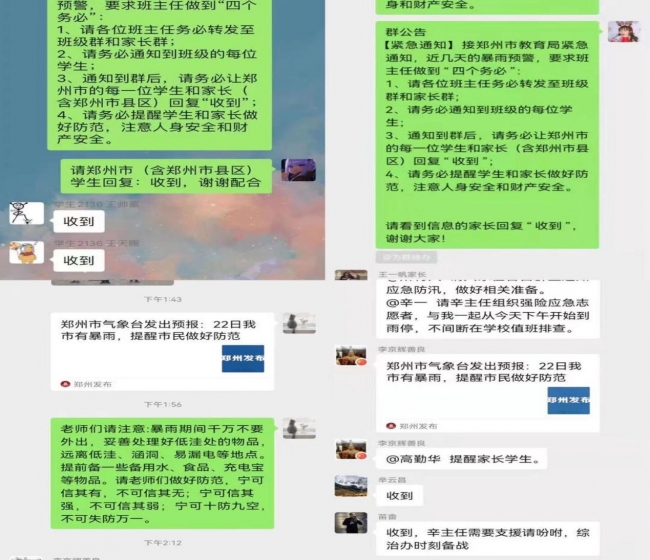 学校即刻起严格执行校园24小时值班、领导带班制度,学校防汛抢险队伍24小时在校守护,保障人员在岗、信息畅通,确保出现险情第一时间获悉、第一时间报告、第一时间处置,实时保持与相关部门联系,及时做好各项应急措施。同时,学校通过校园网、微信群、公众号等,向教职工、家长学生发送安全提醒,提醒师生做好防汛准备。