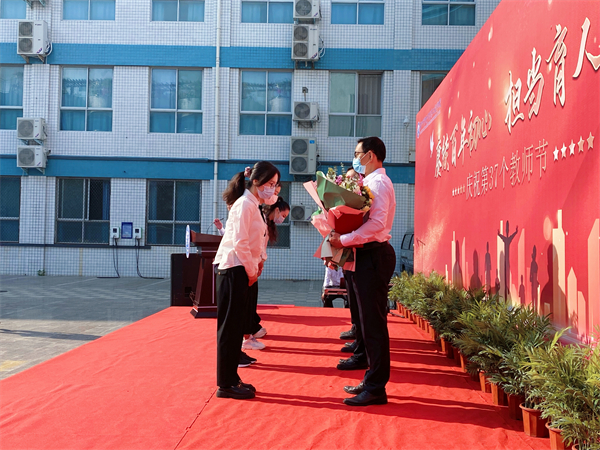 副校长高勤华、焦火锡为三十年以上教龄教师颁奖献花