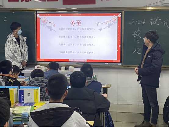 12月20日早晨,郑州市电子信息工程学校举行升旗仪式。仪式上,朱响同学通大家介绍了冬至的由来,以冬至的习俗和弘扬、传承传统节日的意义为重点,号召全体师生都能谨记自己的历史使命,传承中华传统文化。当天下午,各班组织开展了与“冬至”相关的主题班会,各班老师以课件、图片等直观展示的方式,深入浅出地向学生介绍了“冬至”的由来和各地习俗,激发了学生对中华民族的传统节日和节气--“冬至”的浓厚兴趣。