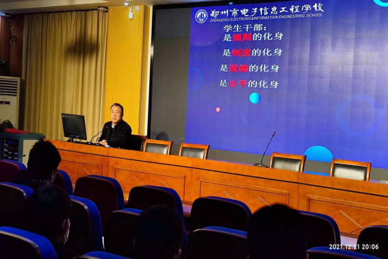 2021年12月22日,郑州市电子信息工程学校召开了第五期学生干部领导力培训会议。该会旨在提高我校学生干部对规则和制度的敬畏之心,帮助学生树立公平公正的工作态度。出席会议的有校党委书记、校长李京辉、政教处政教员赫建富老师和各班学生干部,会议由赫建富老师主持。