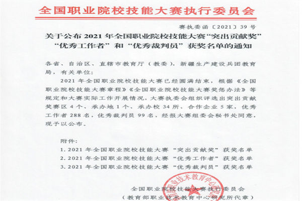 学校被授予全国职业院校技能大赛“突出贡献奖”、“优秀工作者”和“突出贡献奖”