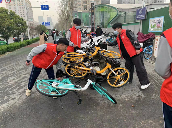 3月17日早上7:30,在我校校团委的学生干部组织下,志愿者们开始规整共享单车志愿服务活动,在活动中,志愿者们积极规整,不喊苦累,他们齐心协力搬运着没有停放好的共享单车,即使沉重繁累,他们也认真积极的完成着。
