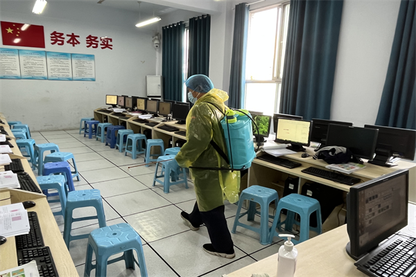 当天上午,学校按照《郑州市电子信息工程学校防控新冠疫情平急转换处置预案》,由校党委书记、校长李京辉任总指挥,各协助疾控部门分别在校门、教室、餐厅、学生宿舍开展等处全流程处置演练,提升应急反应能力。在务本楼上课的2138班学生及当堂授课教师,模拟接到属地疾控部门通知,校园出现一例感染病例,学校立即启动应急预案。政教处通过校园广播通知学生,校办公室通过钉钉公告及其他通讯方式通知全体教师,全校师生立即进入凝滞、暂停状态,并按照程序采取留置隔离,立即开展现场消毒,同时按要求上报。非执行疫情防控职责的任何人原地待命,听从统一指挥。