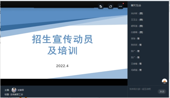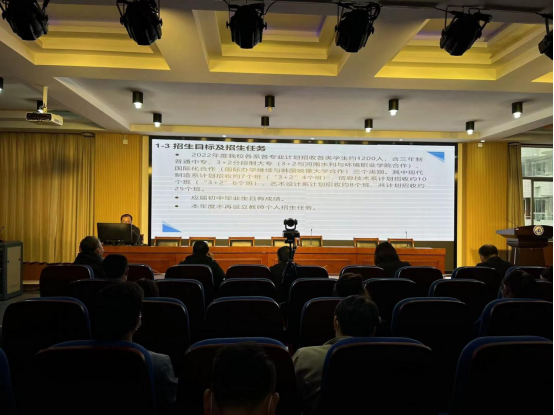 首先由招生就业办主任尹春鹏进行招生宣传培训,解读2022年招生方案,明确今年的招生目标,向各招生工作小组布置招生任务,又进一步对招生工作思路进行了梳理,强调了重要的招生宣传节点,学校的优势和特色,以及招生技巧等。并希望老师们能够发挥主人翁意识,积极参与招生,让学生和家长深入了解学校,增强学生选择来我校学习的信心。最后尹春鹏主任对一直以来和今后为招生工作努力付出的全体老师们表示衷心感谢。