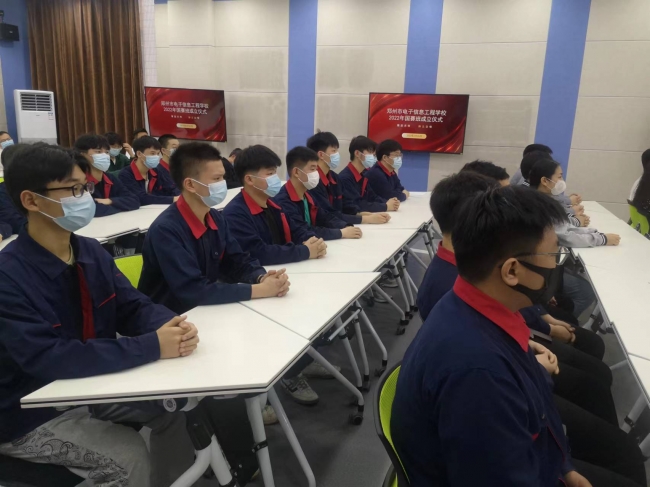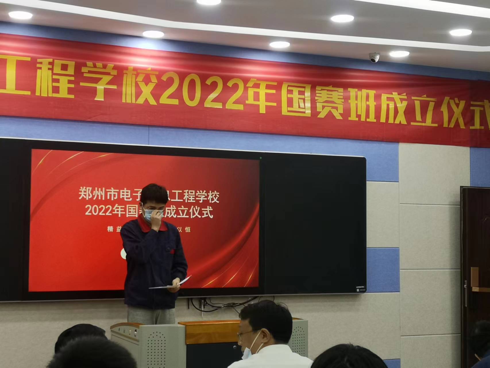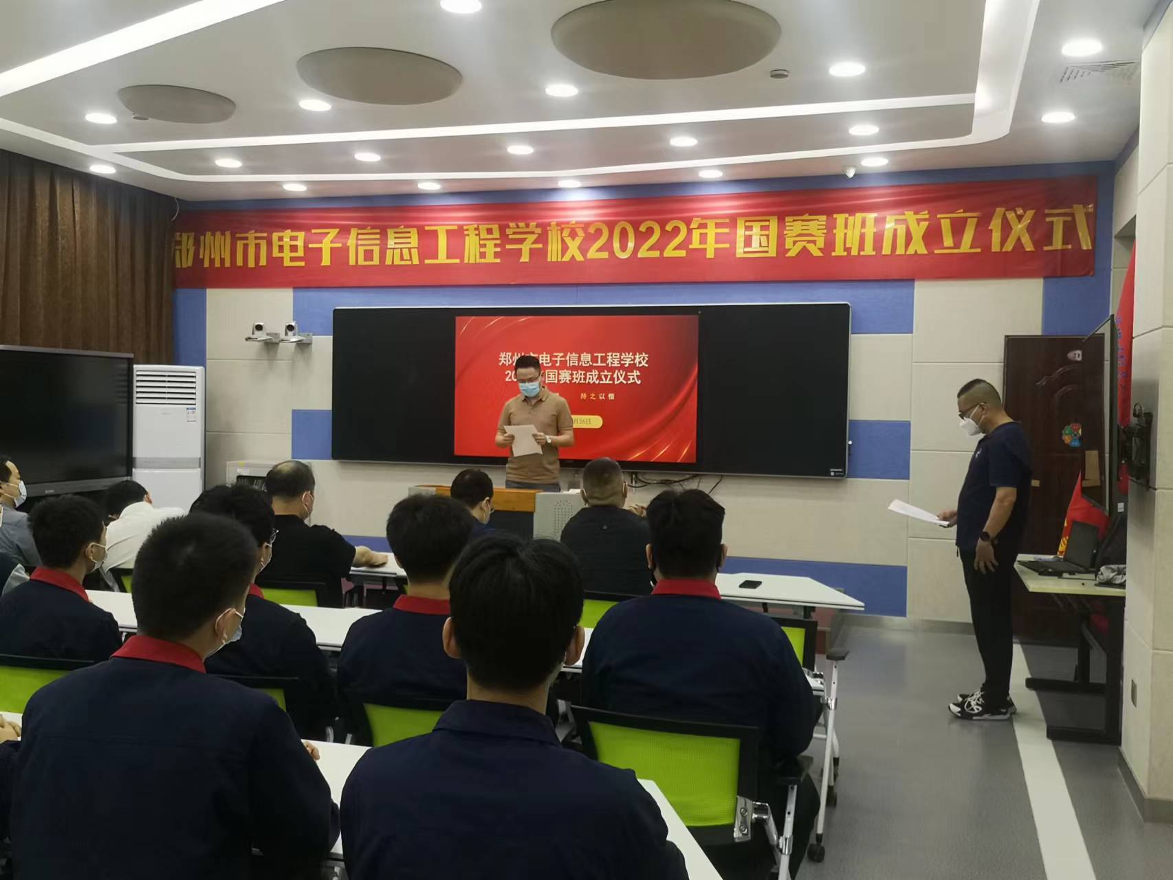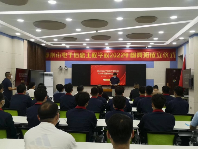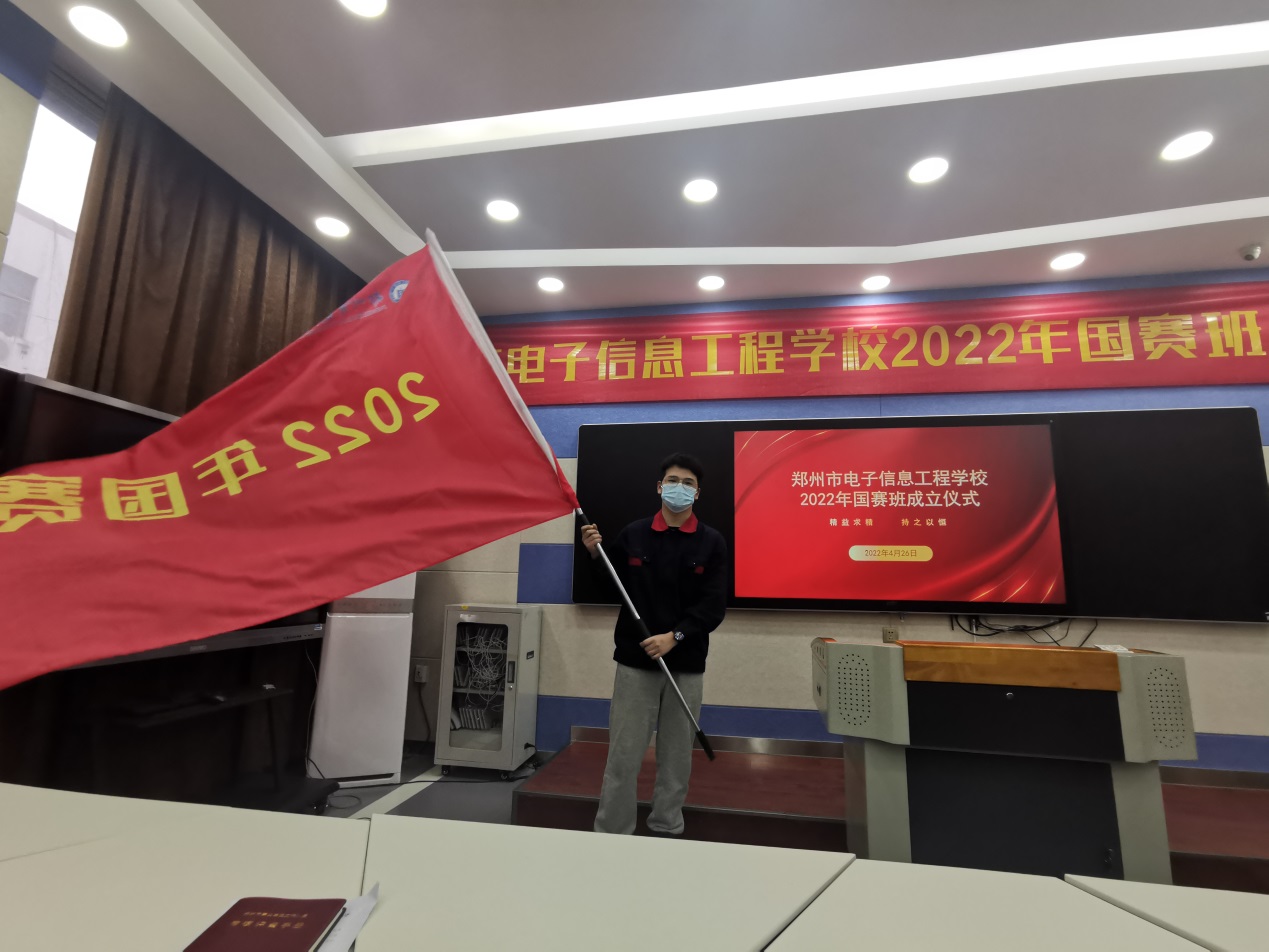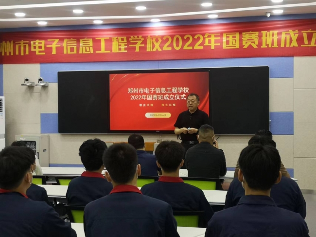 2022年4月26日郑州市电子信息工程学校举行了国赛班成立仪式,学校校长李京辉、副校长李向伟、实训处主任刘奇超、各个系主任、竞赛辅导老师,以及11个国赛项目的21名选手,在庄严的国歌声中,开启了国赛班成立仪式。