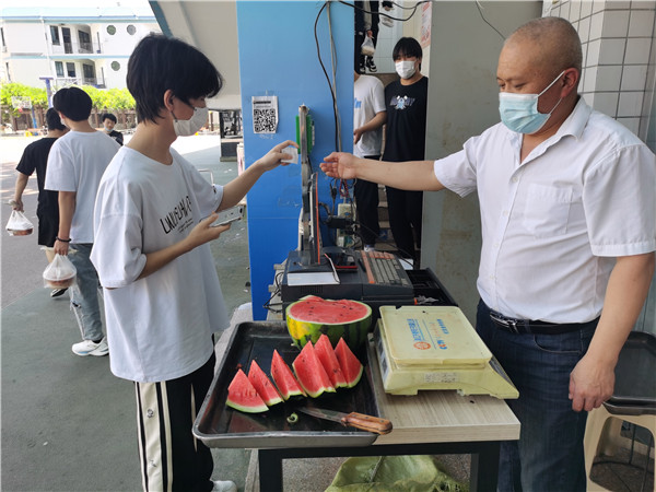 中午,在学生餐厅学生们排队取餐,每个人间隔1米距离,餐厅不仅按照既定计划准备了套餐、面食,还给师生提供了水果、酸奶,学生们只需根据自己需求选购所需食品。据总务处负责人介绍,在静态管理期间,学校还将根据营养搭配,订购黄瓜、西红柿、粽子等食品,让学生们不出校园也能吃得放心、吃得舒心。