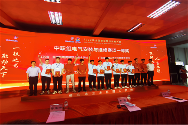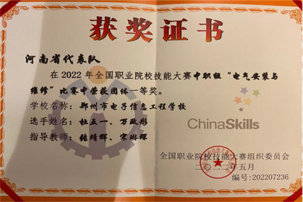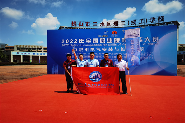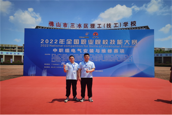 2022年全国职业院校技能大赛中职组“电气安装与维修”赛项于8月22日在广东省佛山市举行。郑州市电子信息工程学校参赛选手杜五一、万政彤在辅导教师张靖辉、宋琳琛指导下,代表河南省与来自全国的63支代表队同台竞技,凭借扎实的专业基础和精妙的操作技术,勇夺一等奖,为学校荣获今年第二枚金牌。