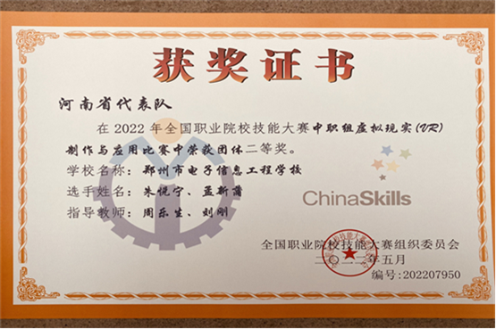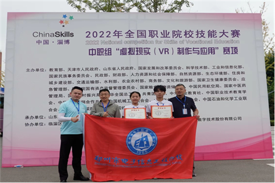 8月26-27日,2022年全国职业院校技能大赛中职组“虚拟现实(VR)制作与应用”赛项在山东省淄博市举行。郑州市电子信息工程学校参赛队代表河南省与来自全国的60支代表队展开激烈角逐,参赛选手朱悦宁、孟新蒲在辅导教师周乐生、刘刚的指导下,凭借扎实的专业基础和良好的心理素质,在历时九小时的比赛中沉着冷静、跨越重重考验,荣获该赛项团体赛二等奖。