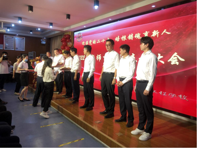 会议在庄严的国歌声中拉开序幕,郑州市电子信息工程学校校长、校党委书记李京辉率领新教师与全体教职工一起重温誓词。会议开始,由2021年拜师结对的师傅代表周路老师发表感言,他表示自己与徒弟虽名为师徒,实为学习伙伴,大家在教学上观摩学习,互砺互取,在年轻教师遇到困难时,师傅应及时做好引领和导向工作,做到“学为人师,行为世范”的言行统一,同时,自己也受到青年教师蓬勃朝气、饱满激情的感染,在与徒弟携手相伴的这一程,师徒二人在青蓝结对中共同得到了提升。青年教师代表徐雪纯首先向关心青年教师成长的领导、师傅周路表达了崇高的敬意,感谢在师傅周路老师的耐心帮助、悉心指导下,更新了教学理念、提高了业务水平、扩宽了业务知识,并表示在今后的教学生涯中,会加倍努力钻研教材、做好教学反思、扎实自己的教学功底和业务能力。