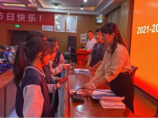政教处主任张丽君、团委书记刘波为获奖宿管干部颁奖