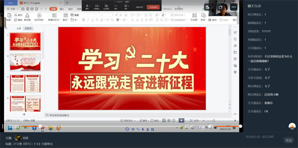 各位团员同学积极踊跃参与了这次云团课活动。认真学习宣传贯彻党的二十大精神,是当前和今后一个时期共青团的首要政治任务。为帮助大家深入学习党的二十大精神,深刻领悟“两个确立”的决定性意义,增强“四个意识”,坚定“四个自信”,做到“两个维护”。如此可见,这次学习是应该的,也更是必要。党的二十大精神的重要意义和丰富内涵,我们应当认真学习积极思考,聚焦“五个牢牢把握”的重要要求,牢记习近平总书记的嘱托,以新时代好青年应有的姿态,奋进新征程,诠释新使命,创造新业绩。