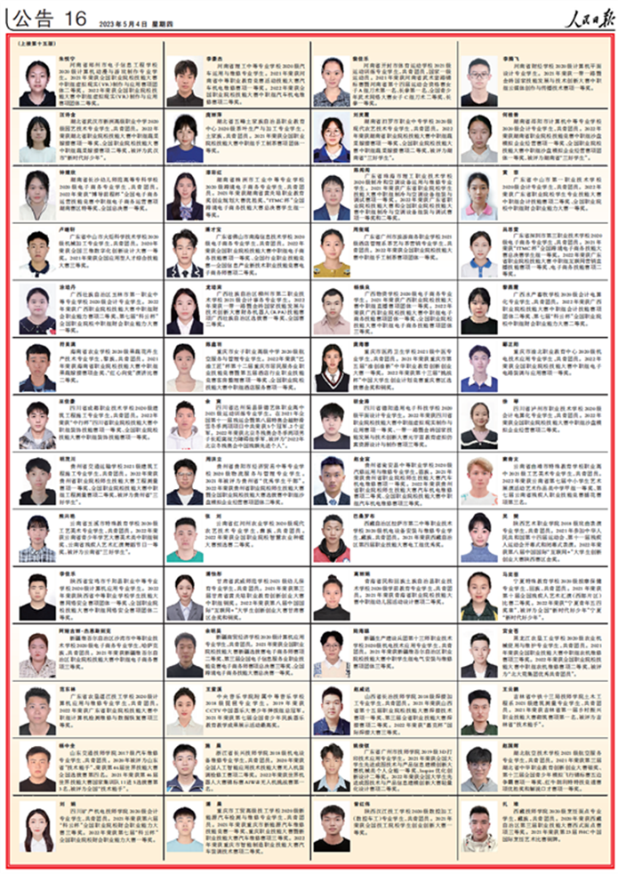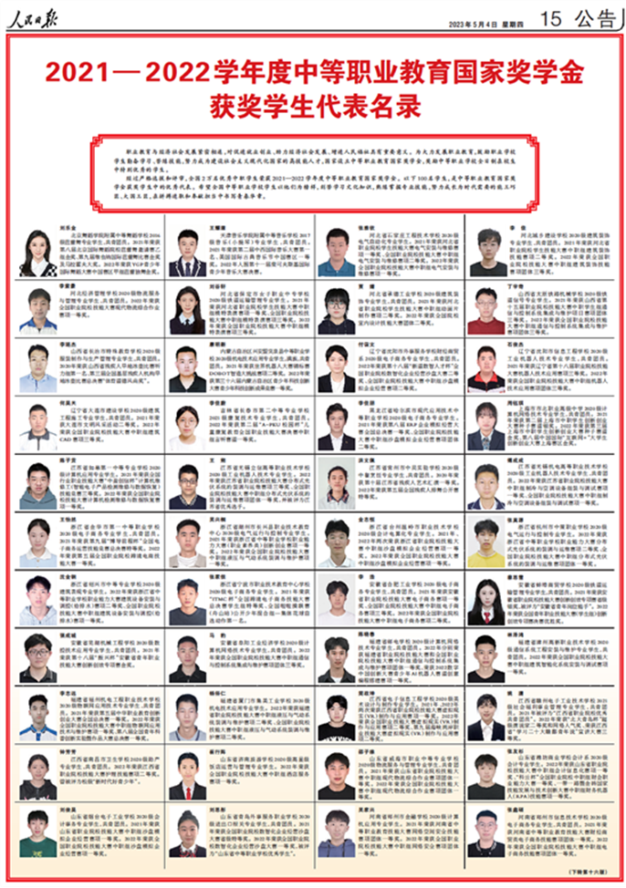 2021-2022学年度中等职业教育国家奖学金经过严格选拔和评审,在全国2万名优秀中职学生荣获国家奖学金中又评出100名国家奖学金优秀学生代表。我校学生朱悦宁在2021年、2022年连续两年荣获全国职业院校技能大赛二等奖,成绩突出,模范作用显著,被选入2021-2022学年度中职国家奖学金优秀学生代表名录。希望全校各专业、各班级以朱悦宁为榜样,刻苦学习文化知识,熟练掌握专业技能,努力成长为时代需要的能工巧匠、大国工匠。