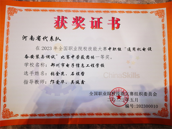 5月16日,在2023年全国职业院校技能大赛中职组通用机电设备安装与调试赛项的颁奖仪式上,郑州市电子信息工程学校以优异成绩获得一等奖,首战告捷,取得国赛出征开门红。