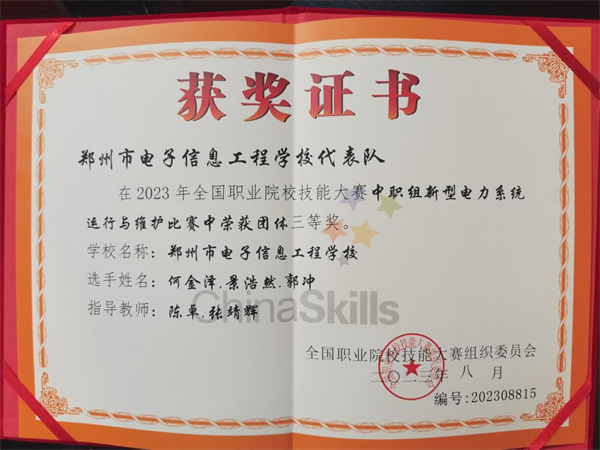 8月17日至20日,2023年全国职业院校技能大赛(中职组)“新型电力系统运行与维护”赛项在昌吉职业技术学院举行。郑州市电子信息工程学校现代制造系教师张靖辉、陈卓担任指导教师,何金泽,景浩然,郭冲三位同学荣获团体三等奖。