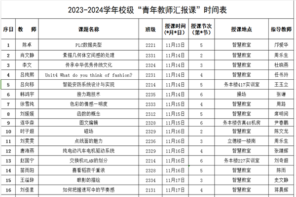 2023年11月17日,郑州市电子信息工程学校青年教师汇报课圆满结束。此次“汇报课”活动历时5天,共有16位青年教师参加。为使本次活动顺利开展,教务处统筹策划,精心安排了课程设置,并将课程表张榜公示,邀请全校老师随堂观摩。