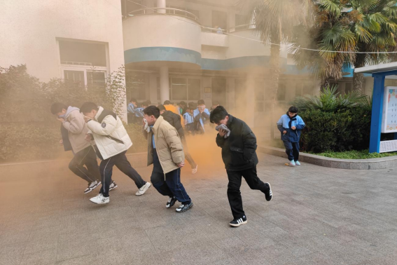 演练开始时,随着消防警报的响起,学生们迅速反应,按照预定的疏散路线,紧张而有序地撤离。他们纷纷用湿毛巾捂住口鼻,低头弯腰,沿着楼梯撤离到学校的安全地带。整个过程快速、有序,没有出现任何混乱或恐慌的情况。