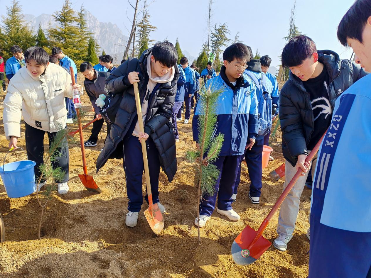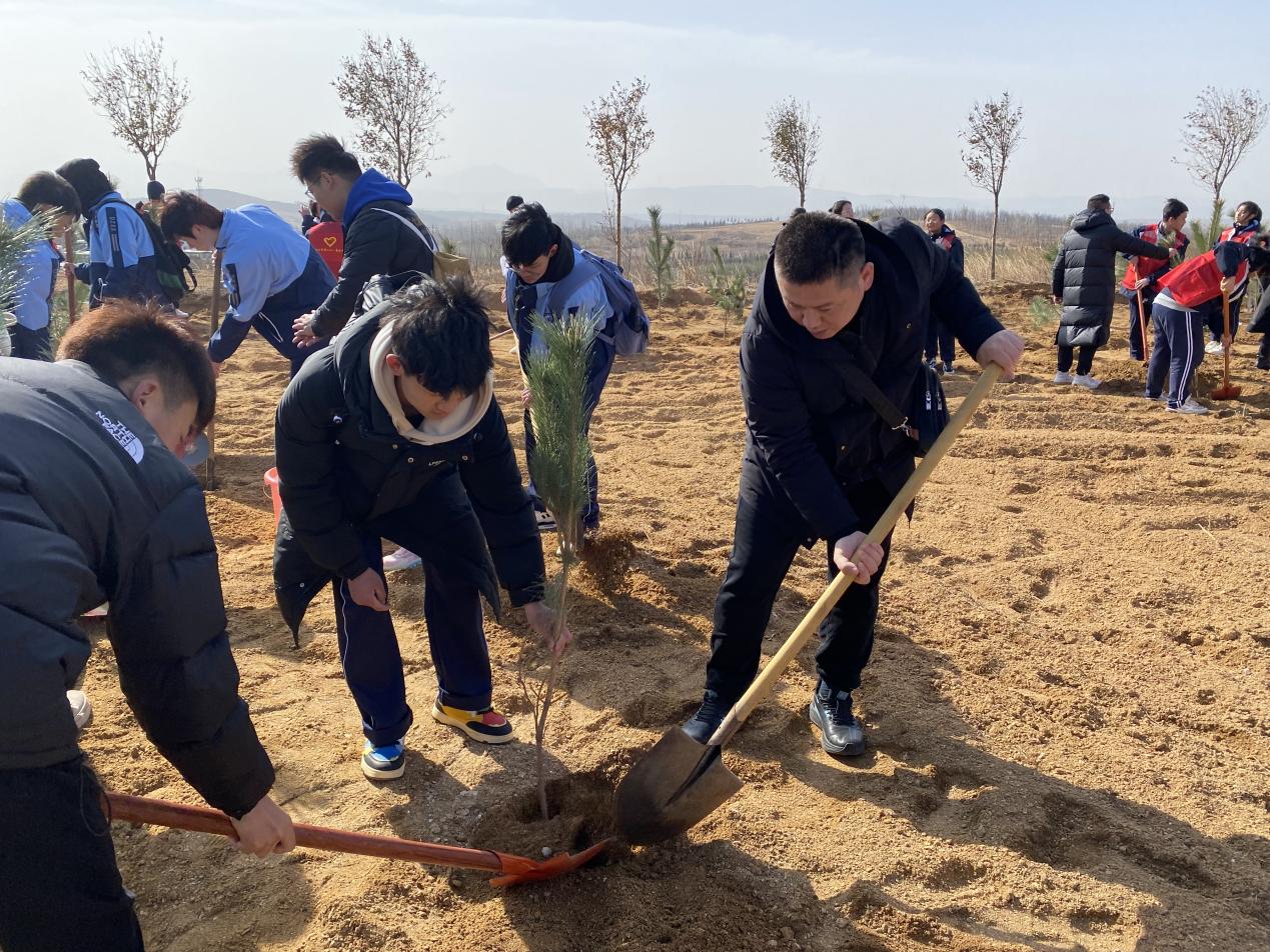 植树现场虽然刮着大风,但是在整个植树过程中,师生们表现出极高的热情与积极性,分工合作。他们手持铁锹、水桶等工具,一部分人负责挖坑,一部分人负责培土,还有一部分人负责浇水。大家热情高涨,干劲十足,每个人都希望自己种下的树苗能在最适宜的环境中茁壮成长。