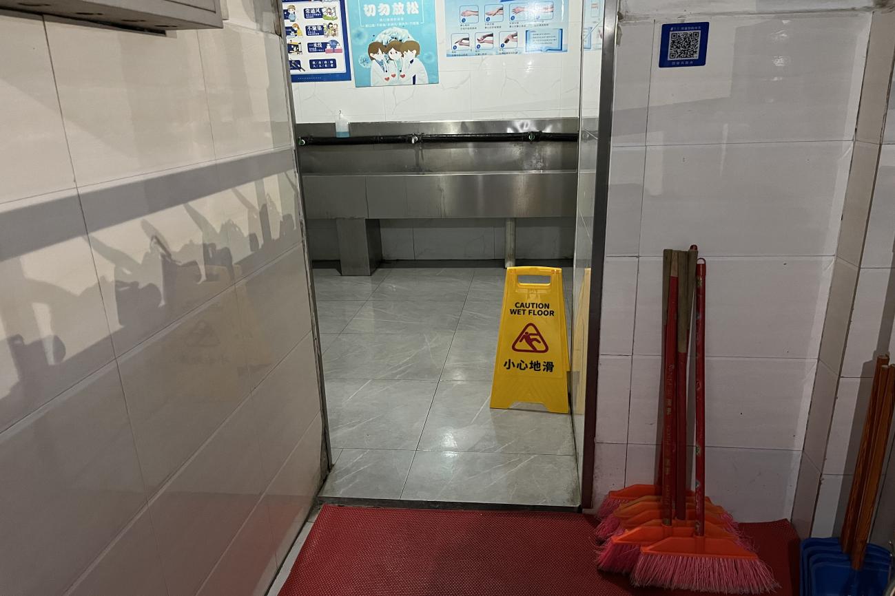 走廊:清洁工具(扫帚、拖把等)统一摆放角落,无积水或杂物堆积。