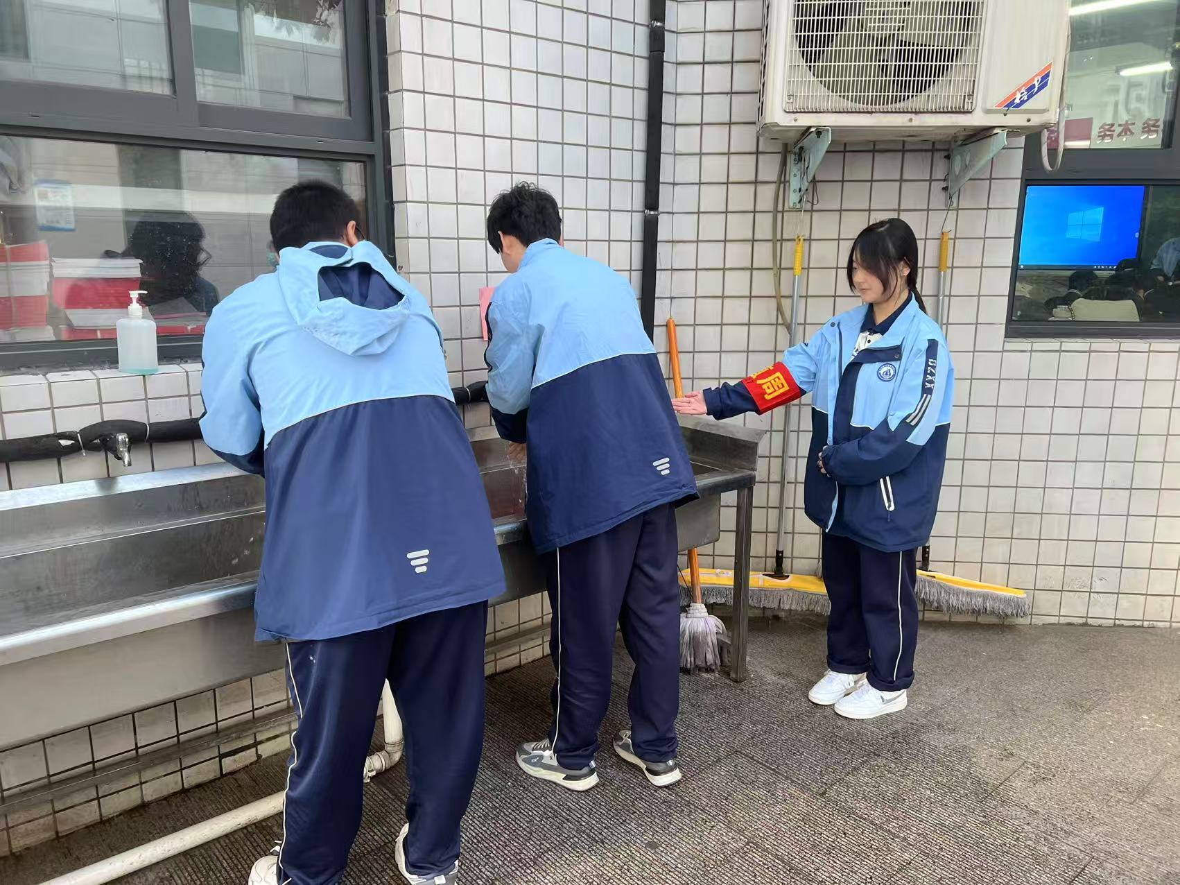清晨的微光洒在校园里的每一个角落,在安静的校园刚开始有了些许动静时,2417班的同学们这时已经开始了他们一天的值周工作。